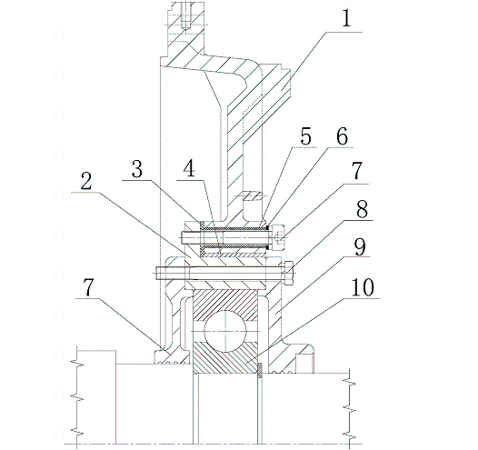 本技術涉及變頻電機,特別涉及一種YVP變頻電機軸承防電腐蝕結構,該結構適用于大功率的變頻電機。 背景技術: 本實用公開了一種大功率變頻電機絕緣軸承套,其通過在軸承的周圍設置絕緣材料來阻隔電流。但是,該技術仍然存在以下幾點不足: (1)內外軸承蓋以及軸承座均 需重新設計,與變頻電機的原系列產品不能通用,產品升級需要的投 入較大; (2)絕緣材料需要通過膠粘的方式和在金屬件上加工鴿尾槽 的方式與金屬件結合,制作十分不便,不利于控制成本。 技術實現要素: 本技術的目的在于,提供一種變頻電機軸承防電腐蝕結構。本設計不僅實現了阻止零序電流經過軸承的目的,且具有實施成本低的優 勢,有利于在產業上推廣應用。 與現有技術相比,本技術的變頻電機軸承防電腐蝕結構能有效阻 止零序電流經過軸承,避免軸承被電腐蝕,保證變頻電機正常運行,從而提高了變頻電機的可靠性,試驗表明,本技術的變頻電機軸承防 電腐蝕結構應用到功率為37kW~1600kW的中大型變頻電機時,電 機軸承不存在電腐蝕現象;此外,與現有技術相比,本技術的變頻電 機軸承防電腐蝕結構還具有以下幾點優勢:(1)本技術中的前、后軸 承蓋的結構和尺寸可以與原系列保持相同,具有變頻電機的零件通用 性,不需要重新設計,使得產品升級的投入較低;(2)本技術中,絕 緣材料不需要通過膠粘的方式與金屬件結合,也不需要通過在金屬零 件上另外加工鴿尾槽與金屬件結合,結構簡單,制作方便,有利于控 制成本。 作為優化,前述的變頻電機軸承防電腐蝕結構中,所述環體部位 于所述套體部的內側端部。環體部位于所述套體部的內側端部時,軸 承套易于制造,有利于控制成本。 作為優化,前述的變頻電機軸承防電腐蝕結構中,所述第一絕緣 管的一端與所述絕緣板接觸,另一端與所述套體部的外側端面齊平。 該結構特征可以防止電機端蓋和軸承套因緊固件松動而發生直接接 觸的情況,進一步提高了絕緣性能,從而使變頻電機的正常運行得到 了進一步保證。 作為優化,前述的變頻電機軸承防電腐蝕結構中,所述第二絕緣 管的一端與所述絕緣板接觸,另一端與絕緣墊圈接觸。該結構特征可 以防止電機端蓋和第二緊固螺栓因松動發生直接接觸,同樣起到進一 步提高了絕緣性能的作用,從而使變頻電機的正常運行得到了更進一 步保證。 為控制成本,作為優化,前變頻電機軸承防電腐蝕結構中,所述 的絕緣板、第一絕緣管、第二絕緣管以及絕緣墊圈均為環氧布材料制 品。進一步,所述絕緣板的厚度為2.5~3.5mm;所述第一絕緣管的 管壁厚度為2.5~3.5mm;所述第二絕緣管的管壁厚度為1.5~ 2.5mm;所述絕緣墊圈的厚度為1.5~2.5mm;試驗表明,絕緣部件 采用上述厚度時,絕緣性能具有保障,成本也較低。更進一步,作為 產業化生產的一個具體方案,所述絕緣板的厚度為3mm;所述第一 絕緣管的管壁厚度為3mm;所述第二絕緣管的管壁厚度為2mm;所 述絕緣墊圈的厚度為2mm 附圖說明 具體實施方式 下面結合附圖和具體實施方式(實施例)對本技術作進一步的說明,但并不作為對本技術限制的依據。 參見圖1和圖2,本技術的變頻電機軸承防電腐蝕結構包括套設 在軸承10外圈上的軸承套2,軸承套2由軸向的套體部21和徑向的 環體部22(環體部22即圖2中圓圈內的部分)構成;所述軸承套2 的套體部21與分別設置在所述軸承10兩側的軸承內端蓋11和軸承 外端蓋9通過第一緊固螺栓8聯接;所述軸承套2的環體部22與電 機端蓋1通過第二緊固螺栓7聯接;所述套體部21與所述電機端蓋 1之間設有第一絕緣管4;所述環體部22與所述電機端蓋1之間設有 絕緣板3;所述第二緊固螺栓7的螺桿和所述電機端蓋1之間設有第 二絕緣管5;所述第二緊固螺栓7的頭部和所述電機端蓋1之間還設 有絕緣墊圈6。 本技術中,沿軸承套2徑向設置的絕緣板3和沿軸承套2軸向設 置的絕緣管4以及第二絕緣管5和絕緣墊圈6起到阻止電流從電機端 蓋1流向軸承套2的作用,從而避免軸承10因零序電流經過對地形 成環流出現電腐蝕的現象。 綜合考慮絕緣性能和制作成本,所述絕緣板3、第一絕緣管4、 第二絕緣管5以及絕緣墊圈6可以采用環氧布材料制品(可以直接從 市場訂購)。所述絕緣板3的厚度可以為2.5~3.5mm;所述第一絕緣 管4的管壁厚度可以為2.5~3.5mm;所述第二絕緣管5的管壁厚度 為可以1.5~2.5mm;所述絕緣墊圈6的厚度可以為1.5~2.5mm。 技術特征: 包括套設在軸承(10)外圈上的軸承套(2),軸承套(2)由軸向的套體部(21)和徑向的環體部(22)構成;所述軸承套(2)的套體部(21)與分別設置在所述軸承(10)兩側的軸承內端蓋(11)和軸承外端蓋(9)通過第一緊固螺栓(8)聯接;所述軸承套(2)的環體部(22)與電機端蓋(1)通過第二緊固螺栓(7)聯接; 所述套體部(21)與所述電機端蓋(1)之間設有第一絕緣管(4);所述環體部(22)與所述電機端蓋(1)之間設有絕緣板(3);所述第二緊固螺栓(7)的螺桿和所述電機端蓋(1)之間設有第二絕緣管(5);所述第二緊固螺栓(7)的頭部和所述電機端蓋(1)之間還設有絕緣墊圈(6)。 2.根據實用要求1所述的變頻電機軸承防電腐蝕結構,其特征在于:所述環體部(22)位于所述套體部(21)的內側端部。 3.根據實用要求2所述的變頻電機軸承防電腐蝕結構,其特征在于:所述第一絕緣管(4)的一端與所述絕緣板(3)接觸,另一端與所述套體部(21)的外側端面齊平。 4.根據實用要求3所述的變頻電機軸承防電腐蝕結構,其特征在于: