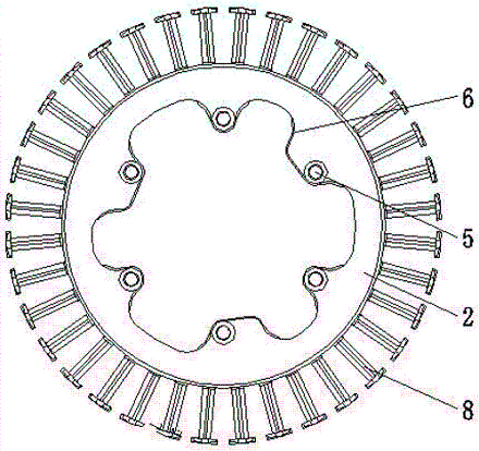 背景技術: 技術實現要素: 本技術的目的在于,提供一種YVP變頻電機定子骨架。它具有受力強度高、使用壽命長的特點。本技術的技術方案:一種YVP變頻電機定子骨架,包括上骨架盤和下骨架盤,所述上骨架盤上設有多個上定位孔,上定位孔外側設有第一加強筋;所述下骨架盤上設有多個下定位孔,下定位孔外側設有第二加強筋,所述第一加強筋與第二加強筋貼合。 前述的YVP變頻電機定子骨架中,所述上骨架盤外側設有多個上支架,上支架上設有矩形槽,所述下骨架盤外側設有多個下支架,下支架上設有矩形臺階,所述下支架經矩形臺階扣入上支架的矩形槽內。 與現有技術相比,它通過設置在定位孔外側的第一加強筋和第二加強筋,加強了定子骨架在安裝孔與上、下定位孔處的受力強度,提高了定子骨架的使用壽命;并通過設置在上、下支架上的矩形槽與矩形臺階的配合安裝,使定子骨架能夠緊密連接,不會因外力出現松動或脫開的現象。本技術還設有繞線柱和高低不同的連接板,使漆包線在繞線時可以互相交錯放置,避免漆包線因相互擦碰導致短路或斷開;第三加強筋可以提高上、下支架的連接強度,進一步提高了定子骨架的使用壽命。 附圖說明 附圖中的標記為:1-上骨架盤,2-下骨架盤,3-上定位孔,4-第一加強筋,5-下定位孔,6-第二加強筋,7-上支架,8-下支架,9-長槽,10-第三加強筋,11-繞線柱,12-連接板,13-安裝柱,14-接插柱,15-安裝孔,71-矩形槽,81-矩形臺階。 具體實施方式 下面結合附圖和實施例對本技術作進一步的說明,但并不作為對本技術限制的依據。實施例。YVP變頻電機定子骨架,構成如圖1所示,包括上骨架盤1和下骨架盤2,所述上骨架盤1上設有多個上定位孔3,上定位孔3外側設有第一加強筋4;所述下骨架盤2上設有多個下定位孔5,下定位孔5外側設有第二加強筋6,所述第一加強筋4與第二加強筋6貼合。 本技術將下支架8經矩形臺階81扣入上支架7的矩形槽71內,使上骨架盤1與下骨架盤2緊密連接,上定位孔3與下定位孔5經骨架盤連接后可置入定位銷,定位銷可以提高定子骨架的受力強度并起到限位作用,防止定子骨架在工作時因外力出現松散或脫開的現象,定位孔外側的第一加強筋4和第二加強筋6可以提高定子骨架在定位孔與安裝孔處的受力強度,防止定子骨架因外力出現變形或斷裂的現象。上、下骨架盤連接后漆包線可經繞線柱11與連接板12進入上、下支架形成繞組線圈,不同高度的連接板12可以使漆包線在繞線時高低交錯放置,防止漆包線在電機工作時因外力相互擦碰導致短路或斷開。上、下支架內側用于放置定子鐵芯,外側用于放置繞組線圈,長槽9用于緩解加工中的塑料收縮問題,第三加強筋10用于提高上、下支架的連接強度;上骨架盤1一端的安裝柱13和接插柱14用于連接變頻電機測速器,通過變頻電機測速器可以實時檢測變頻電機的工作狀態,保證電機的平穩運行。 技術特征: 1.變頻電機定子骨架,其特征在于:包括上骨架盤(1)和下骨架盤(2),所述上骨架盤(1)上設有多個上定位孔(3),上定位孔(3)外側設有第一加強筋(4);所述下骨架盤(2)上設有多個下定位孔(5),下定位孔(5)外側設有第二加強筋(6),所述第一加強筋(4)與第二加強筋(6)貼合。 2.根據權利要求1所述的變頻電機定子骨架,其特征在于:所述上骨架盤(1)外側設有多個上支架(7),上支架(7)上設有矩形槽(71),所述下骨架盤(2)外側設有多個下支架(8),下支架上設有矩形臺階(81),所述下支架(8)經矩形臺階(81)扣入上支架(7)的矩形槽(71)內。 3.根據權利要求2所述的變頻電機定子骨架,其特征在于:所述上支架(7)與下支架(8)上均設有長槽(9),長槽(9)一端設有第三加強筋(10)。 4.根據權利要求1所述的變頻電機定子骨架,其特征在于:所述上骨架盤(1)上設有多個繞線柱(11),相鄰繞線柱(11)之間設有連接板(12)。 5.根據權利要求4所述的變頻電機定子骨架,其特征在于:所述連接板(12)包括多組連接板組,每組連接板組包括三塊由低到高依次設置的連接板單體,連接板單體設置在相鄰繞線柱(11)之間。 6.根據權利要求1所述的變頻電機定子骨架,其特征在于:所述上骨架盤(1)一端設有安裝柱(13)和接插柱(14)。 7.根據權利要求1所述的變頻電機定子骨架,其特征在于:所述上骨架盤(1)上設有安裝孔(15),安裝孔(15)以間隔分布的方式設置在上定位孔(3)一側。 技術總結